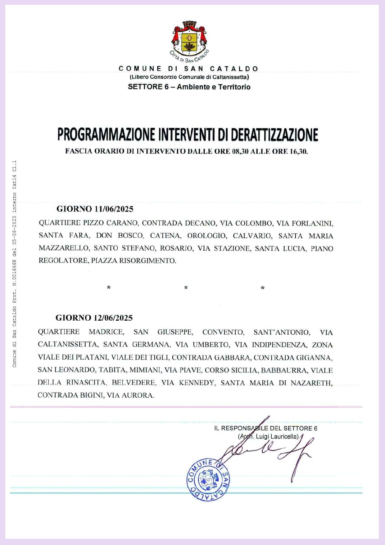 Si avverte la cittadinanza che dall’11 al 12 giugno 2025 saranno espletati i servizi di derattizzazione su tutte le aree abitate della Città di San Cataldo.