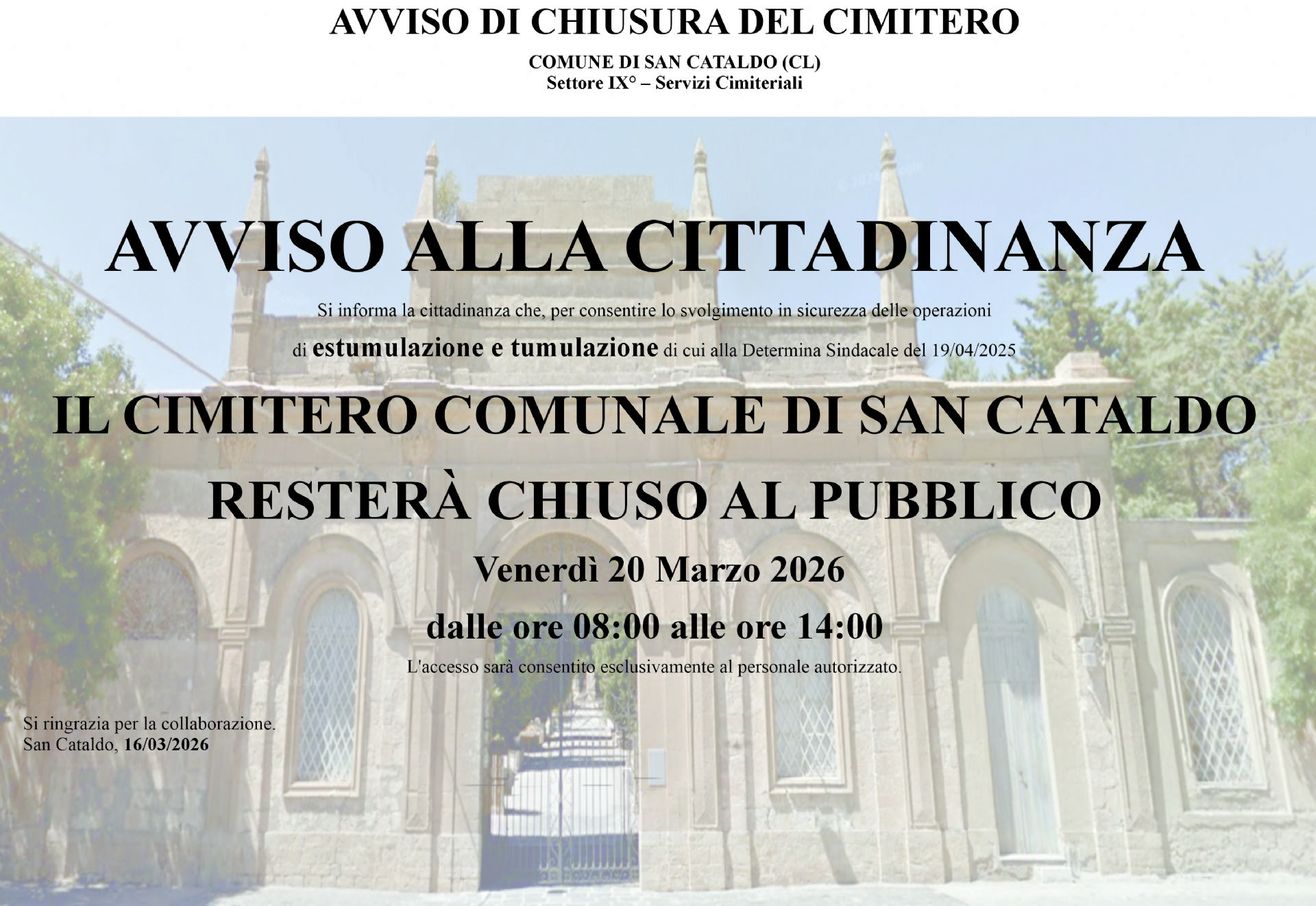 Il Cimitero Comunale di San Cataldo resterà chiuso per Venerdì 20 Marzo 2026 dalle ore 08:00 alle ore 14:00.