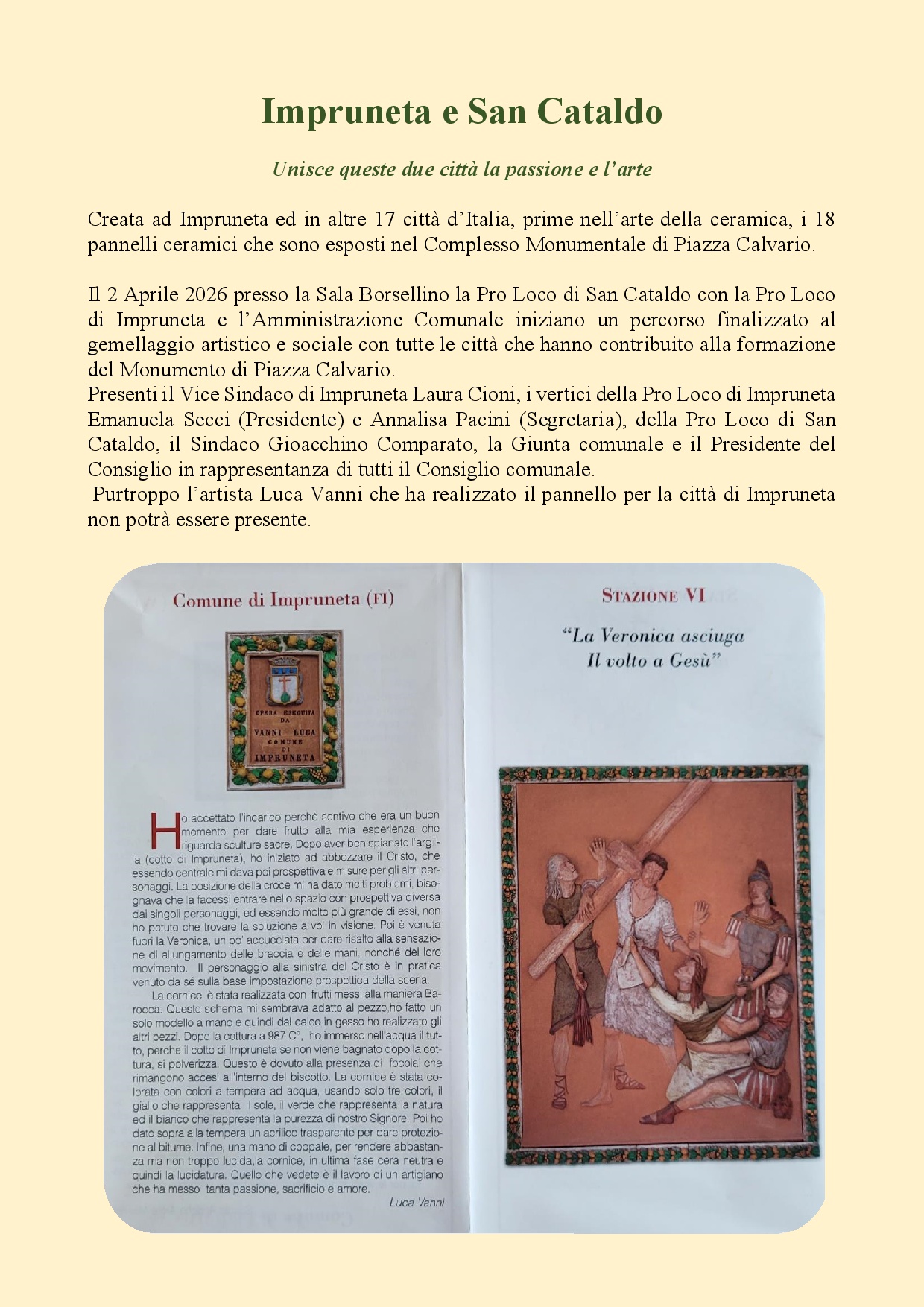 Il 2 Aprile 2026 presso la Sala Borsellino la Pro Loco di San Cataldo con la Pro Loco di Impruneta e l’Amministrazione Comunale iniziano un percorso finalizzato al gemellaggio artistico e sociale con tutte le città che hanno contribuito alla formazione del Monumento di Piazza Calvario.