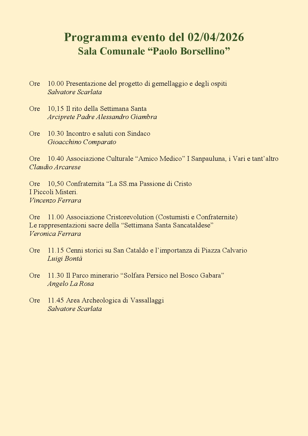 Il 2 Aprile 2026 presso la Sala Borsellino la Pro Loco di San Cataldo con la Pro Loco di Impruneta e l’Amministrazione Comunale iniziano un percorso finalizzato al gemellaggio artistico e sociale con tutte le città che hanno contribuito alla formazione del Monumento di Piazza Calvario.