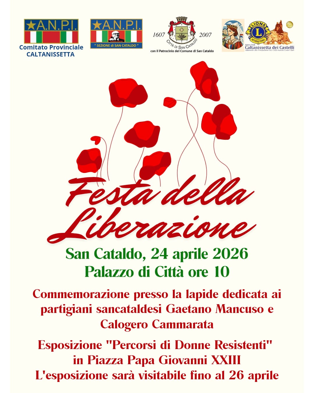 Il 24 aprile alle ore 10:00, momento commemorativo presso la lapide posta sotto il portico del Palazzo di Città a ricordo dei cittadini sancataldesi caduti durante la Guerra di Liberazione (Calogero Cammarata / Gaetano Mancuso), con la presenza delle Istituzioni politiche, civili, associativi e militari.