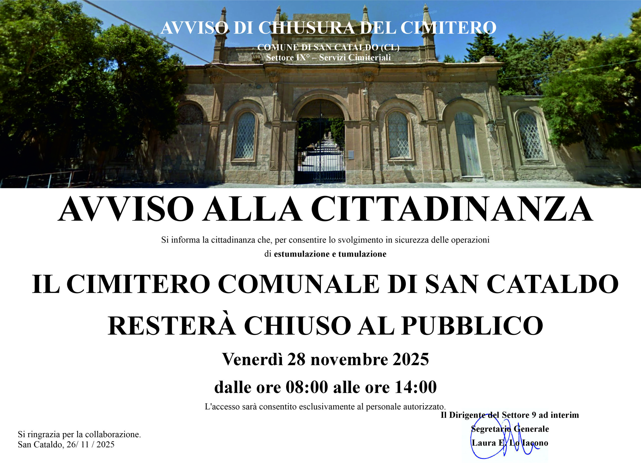 Si informa la cittadinanza che, per consentire lo svolgimento in sicurezza delle operazioni di estumulazione e tumulazione il Cimitero Comunale di San Cataldo resterà chiuso al pubblico Venerdì 28 novembre 2025 dalle ore 08:00 alle ore 14:00